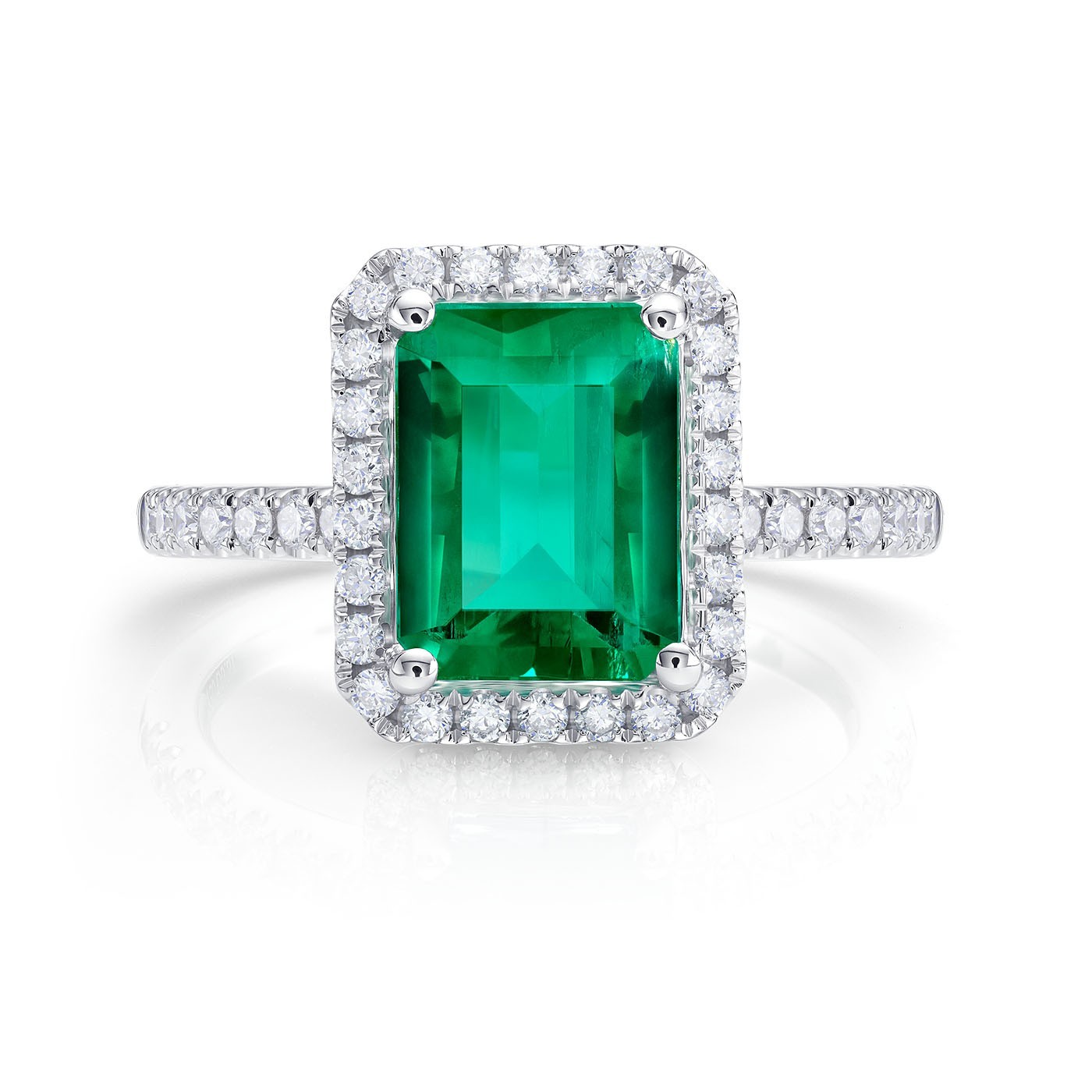 Anillo de oro 18K con esmeralda de 2.22 cts y 42 brillantes. Diseño de alta joyería en estilo clásico