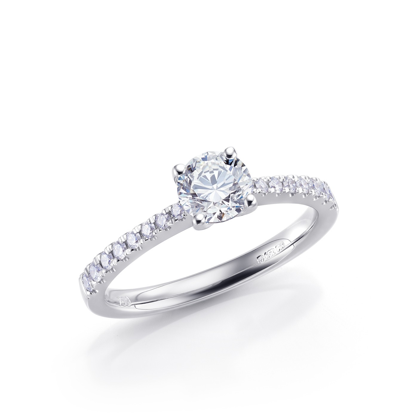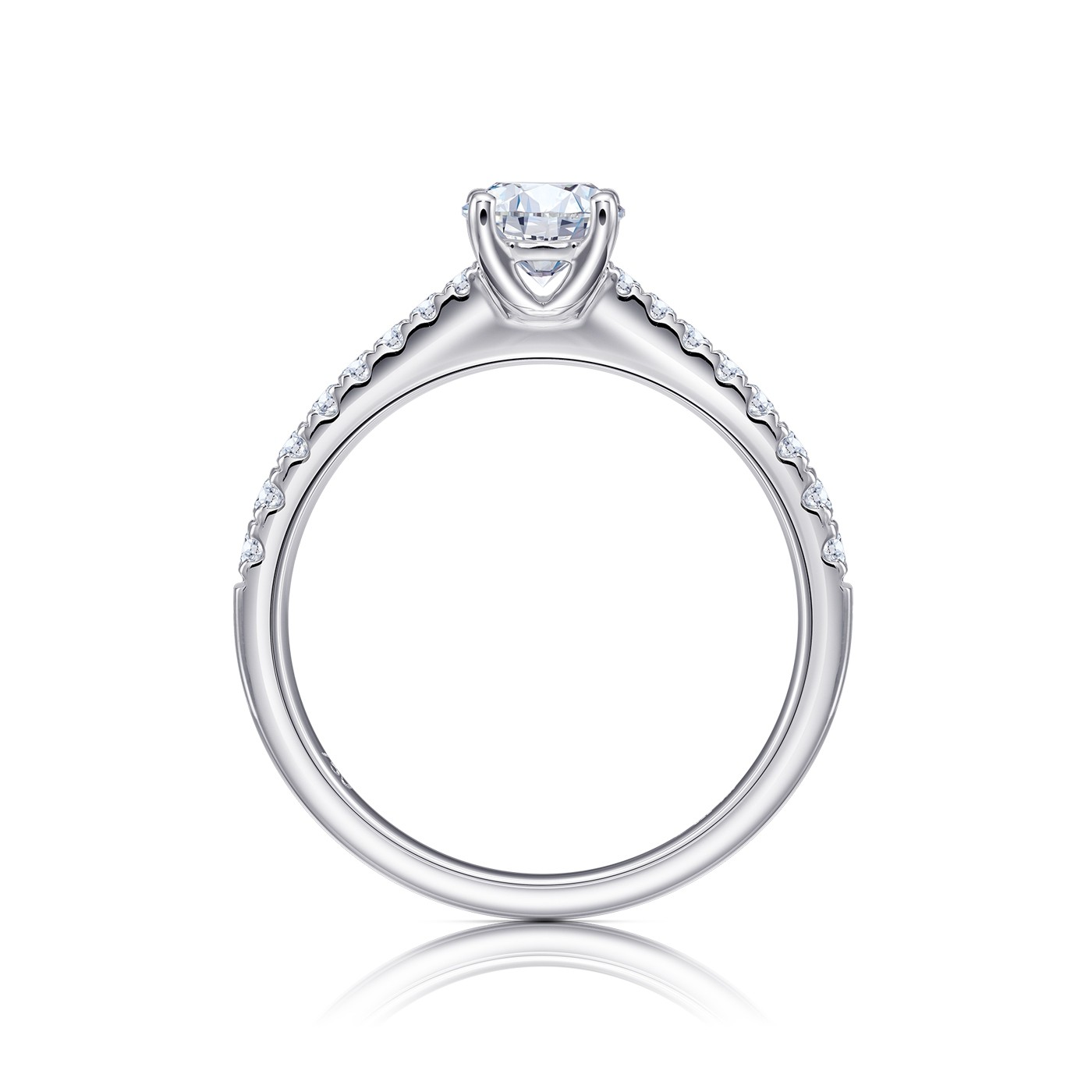 Sortija "Doha" de compromiso de oro blanco y diamantes. Este anillo lleva un diamante central engastado con 4 garras acompañado por brillantes en disminución a ambos lados. Un anillo sencillo y bello realizado con gemas de alta calidad certificada- Ref: SR 143