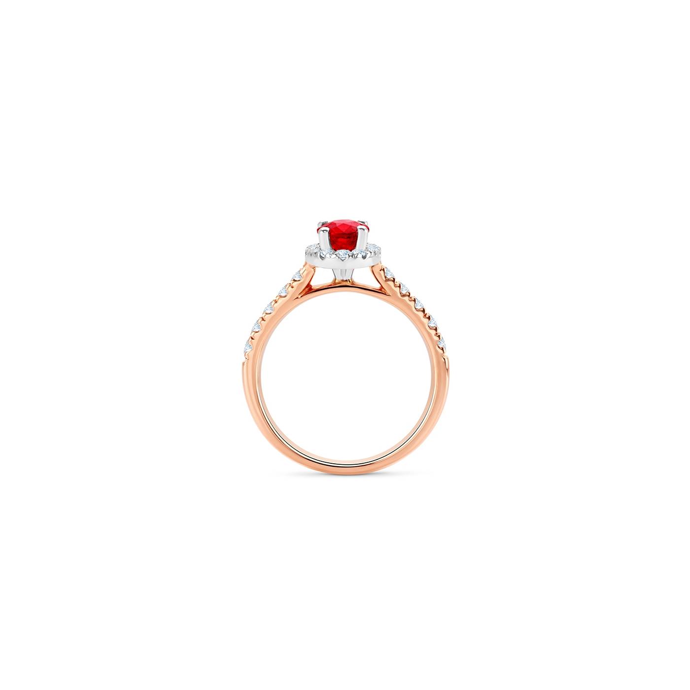 Sortija en oro rosa de 18K con un rubí de 0.73 cts con diamantes en orla y brazos de calidad F/VVS1