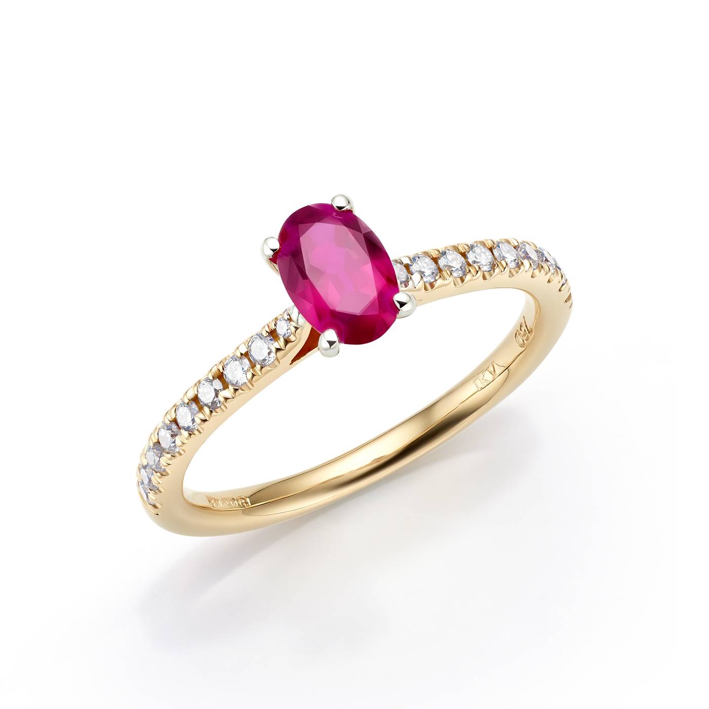 Sortija realizada en oro amarillo de 18K con un Rubí oval de 0.70 csts y diamantes F-VS