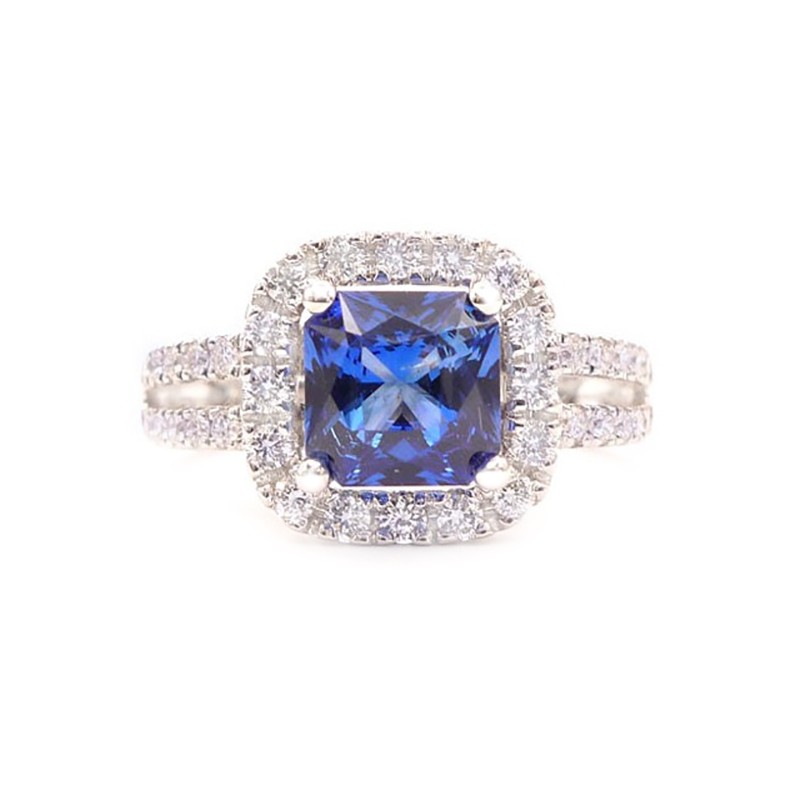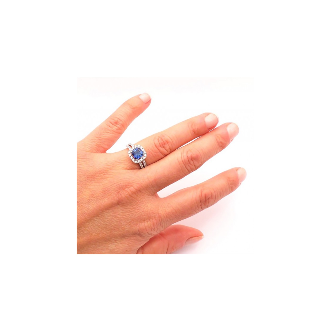 Sortija de Zafiro Ceylan y Brillantes Oro Blanco de gran belleza rodeado por orla de brillantes pequeños y brazo doble de brillantes. Espectacular y favorecedora sortija de alta joyería perfecta para regalo de aniversario. Encuentra en Jorge Juan Joyeros una colección perfecta de Anillos de Zafiros certificados seleccionados en los países de origen con extraordinarias calidades y precios que podrás encontrar en nuestras joyerías especializadas en joyas con piedras preciosas.- SR 89 ZAF