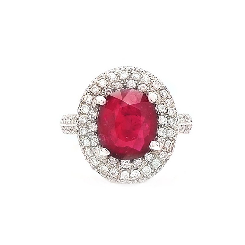 Sortija con Rubí rodeado por un pavé de brillantes y brillantes en brazo. Espectacular color rojo del Rubí de gran tamaño. El color rojo simboliza la pasión. Anillo ideal para aniversario.